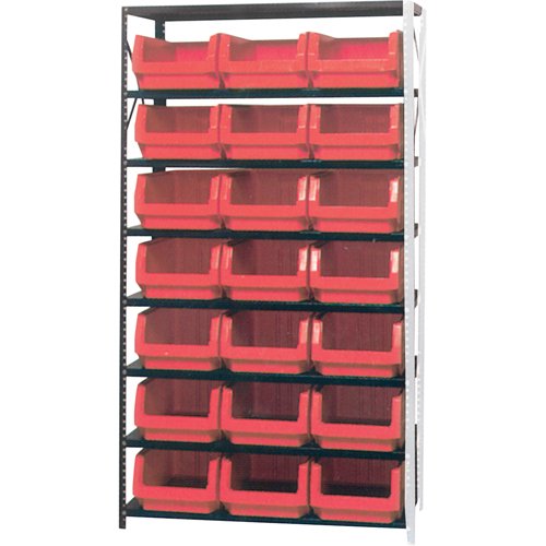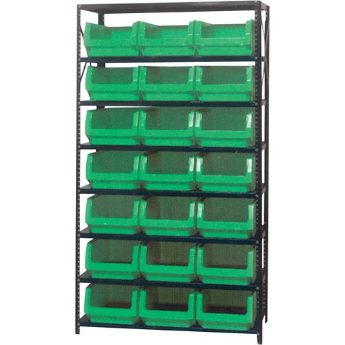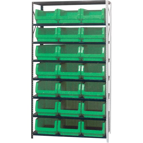 Shipped knocked down Heavy-duty grey enamel shelves Includes: (21) Stacking bins Specifications Kit Type: Starter No. of Shelves: 8 Shelf Capacit...