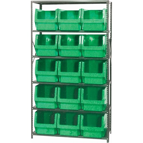 Shipped knocked down Heavy-duty grey enamel shelves Includes: (15) Stacking bins Specifications Kit Type: Starter No. of Shelves: 6 Shelf Capacit...