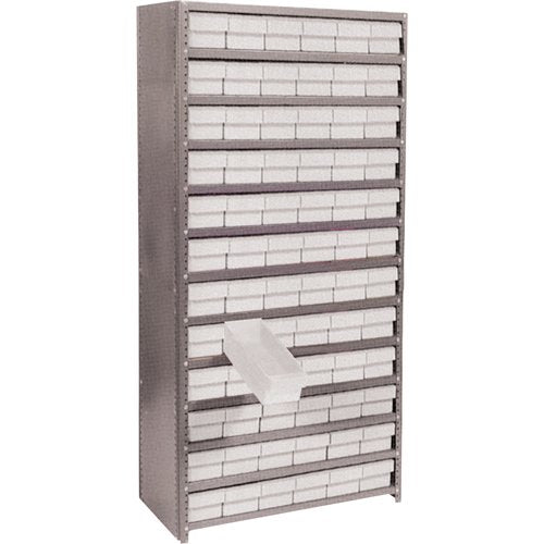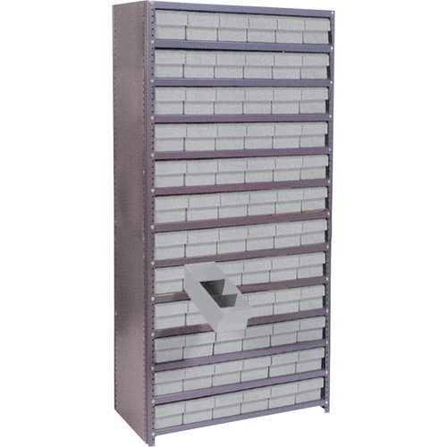 Heavy-duty grey enamel shelves Shipped knocked down Includes: (72) Euro drawer bins Specifications Kit Type: Starter No. of Shelves: 13 Shelf Cap...