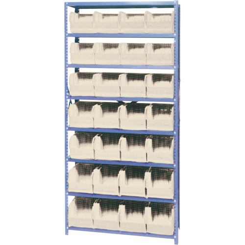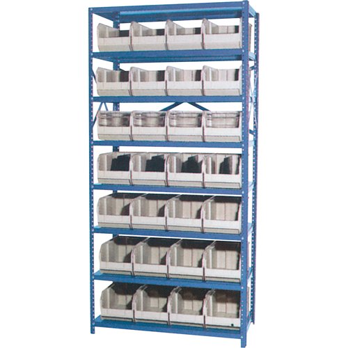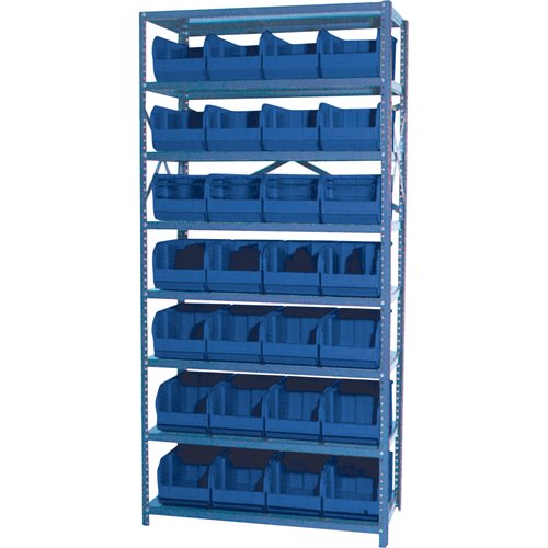 Heavy-duty grey enamel shelves Shipped knocked down Includes: (28) Euro drawer bins Specifications Kit Type: Starter No. of Shelves: 8 Shelf Capa...