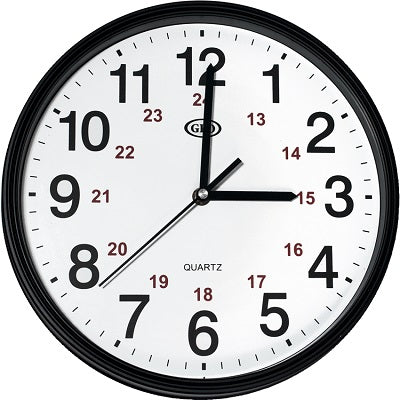 Bates® 12-Inch Commercial Quartz Clock, Traditional. 12-inch wall clock with stylish black case and white face. 12 and 24 hour times shown. Quartz ...