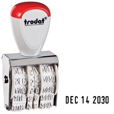 Trodat® 1010 Daters have a 4mm character size. Sturdy steel frame; twelve-year band. Lifetime Warranty on mechanism. Use with a stamp pad (sold se...