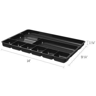 Merangue Drawer Organizer. Consists of 8 compartments to organize a variety of office supplies. Made of polystyrene. 14"W x 8-3/4"D x 1-1/5"H. Black.