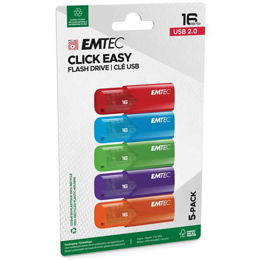 View full detailsFlash Drive-Emtec Click Easy Usb 2.0 16Gb, Assorted 5-Pack