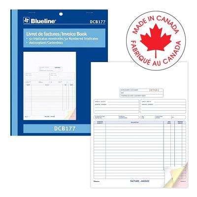 Blueline® Manifold book with flexible blue cover. Carbonless numbered forms. 50 triplicates. Bilingual. Made in Canada.