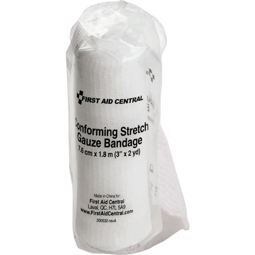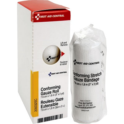First Aid Central conforming gauze. Conforms to the contour of the body. Helps keep dressings in place Sterile. Individually wrapped. 2" x 15'.