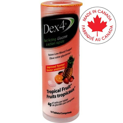 Dex4 Fast Acting Glucose Tablets. Fast acting glucose tablets. Raises low blood sugar. Tropical fruit flavour. 4 g. 10/pk.