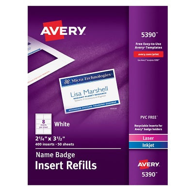 Avery® Name Badge Inserts for Laser and Inkjet Printers, 2-1/4 x 3-1/2. Easily design badges using the free Avery® Design and Print Online software...