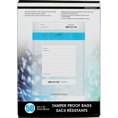 Merangue Tamper Proof bags. Tamper-evident top closure. Waterproof. Tear-off receipt for easy tracking. Bag is barcoded and numbered to match recei...