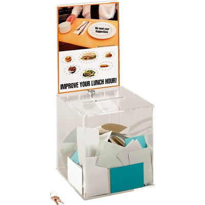 Large acrylic collection box is an office suggestion box with a 4" x 1/2" slot in top and a sliding back panel for easy access to submissions. The ...