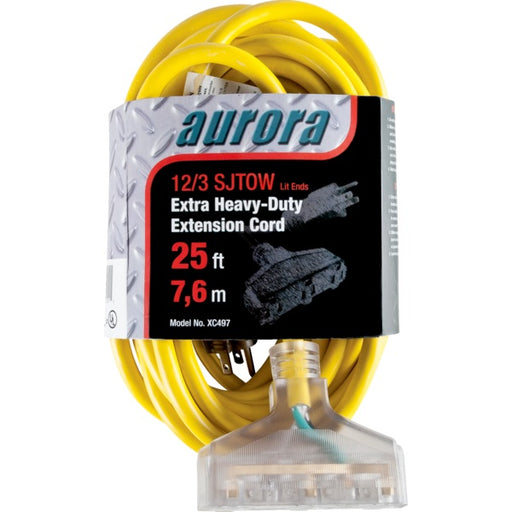 Aurora Tools Outdoor Vinyl Triple Tap Extension Cord with Light Indicator. Designed for industrial and contractor use. Vinyl jacket protects agains...