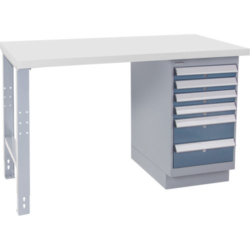 Features one adjustable steel leg and one pedestal Pre-designed workbenches are a simple, easy-to-assemble solution Available in many configuratio...