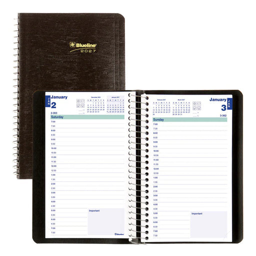 ESSENTIAL: 12 Months, January to December DURABLE: Spiral binding, lizard-like soft cover SCHEDULE: Day per page, daily appointment schedule (30 m...