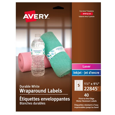Avery® Durable Wraparound Labels for laser and inkjet printers. Their water-resistant material and permanent adhesive make them perfect for brandin...