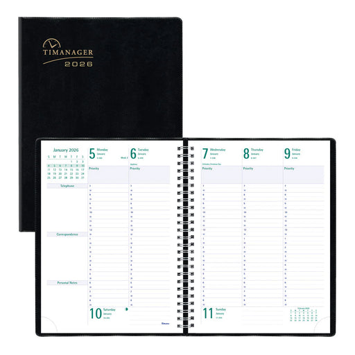 Blueline 5-day Weekly/Monthly Timanager has a double spiral binding and black soft vinyl cover. Appointments from 7:00 a.m. to 8:30 p.m. at interva...