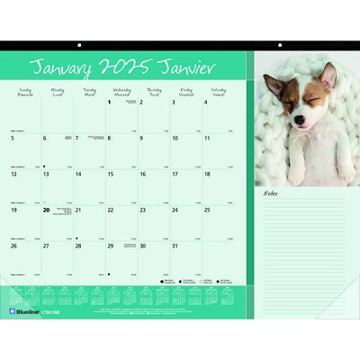 Blueline monthly desk pad calendar. Different dog image each month. Reinforced cardboard stand and clear vinyl corners. Detachable sheets connecte...