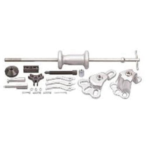 Includes: shallow flange, deep flange, 3-way yoke, center bolt and cone, 3-piece adapter set, 24" slide hammer, blow mold case for storage Provide...