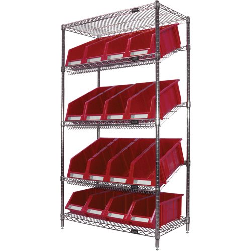 Slanted shelving allows for better visibility of stored items Includes: (3) Slanted shelves, (2) Flat shelves, (16) Red shelf bins Specifications ...