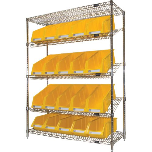Slanted shelving allows for better visibility of stored items Includes: (3) Slanted shelves, (2) Flat shelves, (20) Yellow shelf bins Specificatio...