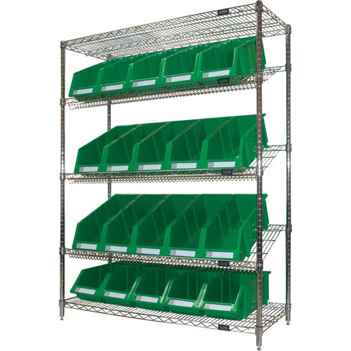 Slanted shelving allows for better visibility of stored items Includes: (3) Slanted shelves, (2) Flat shelves, (20) Green shelf bins Specification...