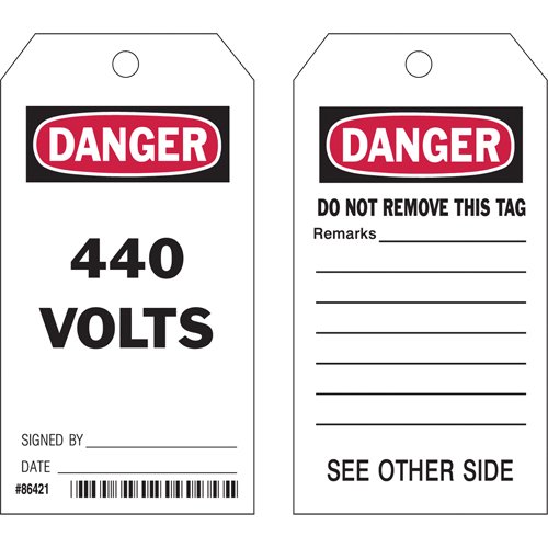 Specifications Language: English Material: Cardstock Width: 3" Height: 5-3/4" Additional Specifications Legend: Danger 440 Volts