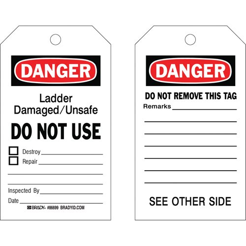 Specifications Language: English Material: Cardstock Width: 4" Height: 7" Additional Specifications Legend: Danger Ladder Damaged/Unsafe Do Not Use