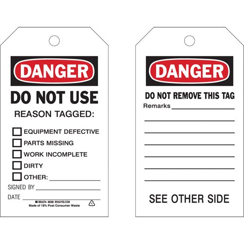 Specifications Language: English Material: Plastic Width: 4" Height: 7" Additional Specifications Legend: Danger Do Not Use Reason Tagged Sold/Pr...
