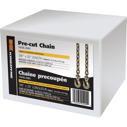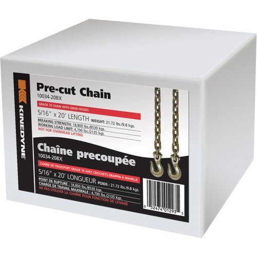 All Chain is Transportation Grade 70 Precut to either 16, 20 or 25 foot lengths Comes fully assembled with installed grab hooks Gold dichromate fi...