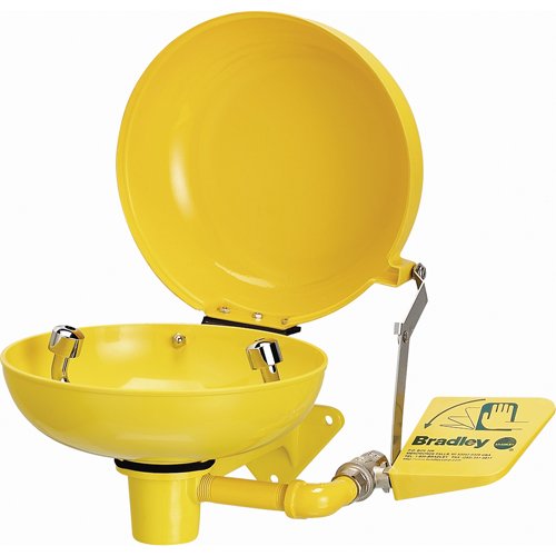 Wheeled cart simplifies transportation of Bradley On-Site® gravity-fed eyewash stations High-visibility yellow Captures used fluid Tapered sump, e...