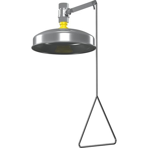 SpinTec ™ showerhead activated by a stainless steel pull rod and 1" IPS chrome-plated stay-open ball valve Impact-resistant plastic eyewash bowl w...