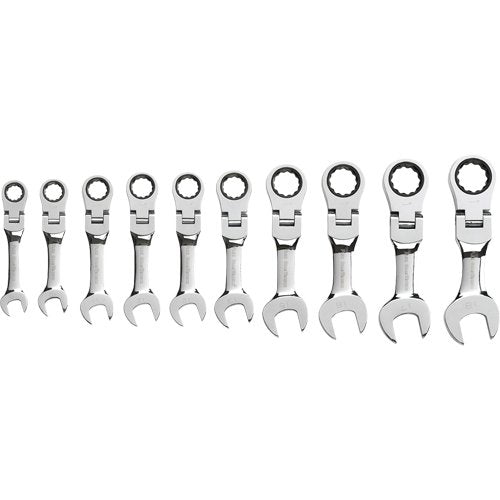 Metric 10-piece set 10 mm to 19 mm Flex Head tilts up to 180° Ratcheting box end needs as little as 5° to move fasteners Up to 25% more torque wit...