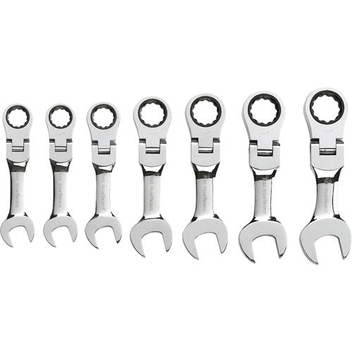SAE 7-piece set 3/8" to 3/4" Flex Head tilts up to 180° Ratcheting box end needs as little as 5° to move fasteners Up to 25% more torque with less...