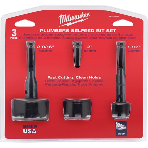 Includes: (1) 1-1/2" Self feed Bit, (1) 2" Self feed Bit, (1) 2-9/16" Self feed Bit, (6) Feed Screws, (3) Set Screws, (1) Hex Key Allows easy hole...
