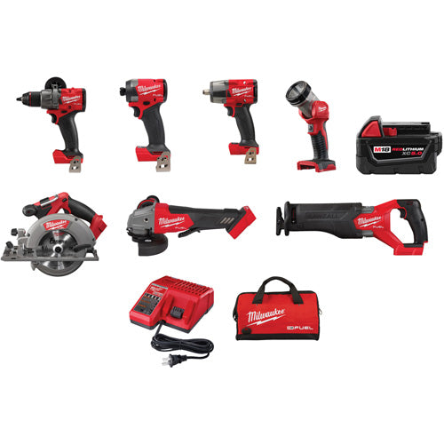 This power tool kit features seven M18 Fuel™ 18-Volt lithium-ion brushless cordless tools, including a 1/2 in. hammer drill, 1/4 in. impact driver...