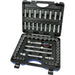 - Includes: Deep Length Metric Sockets (10, 12, 13, 14, 15, 16, 17, 18, 19, 21 mm); Deep Length SAE Sockets (7/16, 1/2, 9/16, 5/8, 11/16, 3/4, 7/8"); Standard Length Metric Sockets (10, 11, 12, 13, 14, 15, 16, 17, 18, 19, 21, 22, 23, 24, 27, 30, 32 mm); Standard Length SAE Sockets (3/8, 7/16, 1/2, 9/16, 5/8, 11/16, 3/4, 13/16, 7/8, 15/16, 1, 1-1/16, 1-1/8, 1-3/16, 1-1/4"); 72-Tooth high torque ratchet (672928); 2" Extension (672904); 5" Extension (672905); 10" Extension (672906); 10" Sliding T-handle (672907); 2-3/4" Universal joint (672908); Blow mould case with removable lid