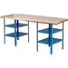 • Feature 1 3/4" thick solid laminated hardwood top, mounted on two all-welded pedestals with two shelves each