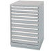• Drawers 1 to 2: 36 divisions with red plastic inserts, 2" H; Drawers 3 to 4: 24 divisions, 2" H; Drawers 5 to 6: 20 divisions, 3" H; Drawers 7 to 8: 16 divisions, 3" H; Drawers 9 to 10: 9 divisions, 3" H