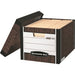 Bankers Box R-Kive Fastfold File Box. Fastfold set-up. Contains a minimum of 50% post-consumer recycled material. Locking lid. 850 lb. stacking strength. Letter or Legal size. 12"W x 15"D x 10"H. Woodgrain. 4 boxes/pkg.