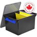 Storex storage file tote has a snap-on lid and locking handle to ensure that tote contents stay put through tosses and tumbles. Stores letter or legal hanging files and folders. Stackable up to 6 units high and holds 35 lbs. per tote. Moisture and mildew