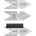 • Made of spring-tempered steel with satin chrome finish; HU513 - CENTRE GAUGES ; Top view, front 60° angle side; middle view, back with double depths of threads gauge; bottom view, same gauge with centre gauge attachment.