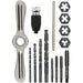• Includes: (1) 1/4"-20 NC Straight Flute Plug Tap; (1) 5/16"-18 NC Straight Flute Plug Tap; (1) 3/8"-16 NC Straight Flute Plug Tap; (1) 1/2"-13 NC Straight Flute Plug Tap; (1) 1/4"-20 NC 1-Inch Hex Threading Die; (1) 5/16"-18 NC 1-Inch Hex Threading Die; (1) 3/8"-16 NC 1-Inch Hex Threading Die; (1) 1/2"-13 NC 1-Inch Hex Threading Die; (4) Drill Bits of Various Sizes; (1) T-Handle Bar; (1) Tap Collet; (1) Hex-Lok™ 2-in-1 Handle