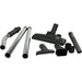 - Includes: (1) Floor nozzle, (1) Square brush nozzle, (1) Universal nozzle, (1) Crevice nozzle, (1) Pipe holder, (2) 19" stainless steel extension tubes, (1) Curved tube handle