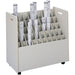 • Materials store upright in square fibreboard tubes; grandstand design allows different size rolls to be stored in one file