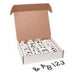 - Includes (20) each of A, E, I, L, N, O, R, S, T and 1 to 9, (10) each of remaining letters, and (5) each of $, &, and punctuation