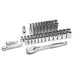 - Includes: 1/2" Drive Universal Joint, 1/2" Drive 6 Point Standard SAE Socket (7/16", 1/2", 9/16", 5/8", 11/16", 3/4", 13/16", 7/8", 15/16", 1", 1-1/16", 1-1/8"), 1/2" Drive 6 Point Deep SAE Socket (1/2", 9/16", 5/8", 11/16", 3/4", 13/16", 7/8", 15/16"), 1/2" Drive 6 Point Standard Metric Socket (10mm, 11mm, 12mm, 13mm, 14mm, 15mm, 16mm, 17mm, 18mm, 19mm, 20mm, 21mm, 22mm, 23mm, 24mm), 1/2" Drive 6 Point Deep Metric Socket (10mm, 11mm, 12mm, 13mm, 14mm, 15mm, 16mm, 17mm, 18mm, 19mm), 1/2" Drive Extension (3" & 5"), 1/2" Drive 90-Tooth Teardrop Ratchet 11"
