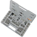• Includes: #4-40 Hex die and plug; #6-32 Hex die and plug; #8-32 Hex Hex die and plug; #10-24 Hex die and plug; #10-32 Hex die and plug; #12-24 Hex die and plug; 1/4-20 Hex die and plug; 1/4-28 Hex die and plug; 5/16-18 Hex die and plug; 5/16- 24 Hex die and plug; 3/8-16 Hex die and plug; 3/8-24 Hex die and plug; 7/16-14 Hex die and plug; 7/16-20 Hex die and plug; 1/2-20 Hex die and plug; 1/8-27 NPT Hex die and plug; Adjustable long-handled tap wrench; T-handle 1/16-3/16 shank taps; 1" Hex die stock; Slot screwdriver; SAE Pitch Gauge; Blow mould case